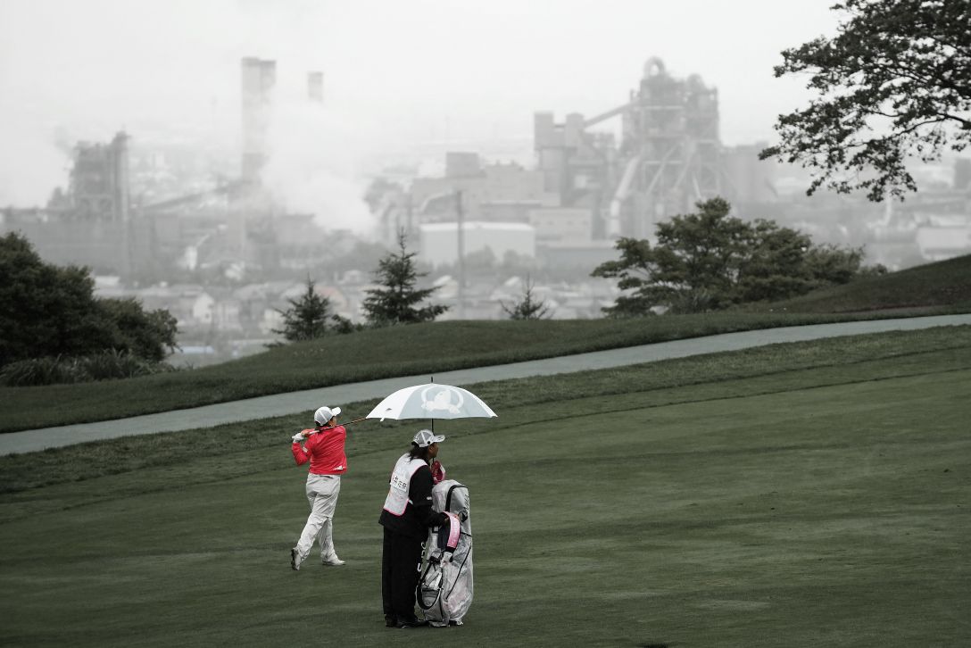 自然は、時として見たことがないシーンを演出する。雨が予期していなかったワンショットをプレゼントしてくれた。永井花奈さん、10番の第2打。セメント工場が背景にある。それも、モノトーンの世界が広がった。まったく結びつかないような光景が1枚に収まってしまう。