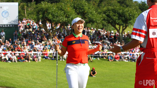 元世界ランク1位に火がついたのは14番グリーンだった。バーディー合戦のまま突入したサンデーバックナイン。この日スコアを8つ伸ばしたリエスド、イナリ、申ジエが11アンダーで並ぶ混戦状態となっていたが、それをイナリが破ったのだった。イーグル賞が懸けられた15番パー5で「自分でもびっくりして思わず声が出てしまいました」と3打目のアプローチを直接チップインさせ、頭2つ抜け出してみせたのだ。