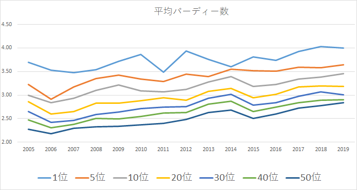 渋野は穴井よりも昨シーズン、出場数が8試合少ない。平均バーディー数4.00と第1位である。1ラウンドで4つのバーディーを獲得している計算に。超攻撃的スタイルはファンから絶大な支持を集めた。