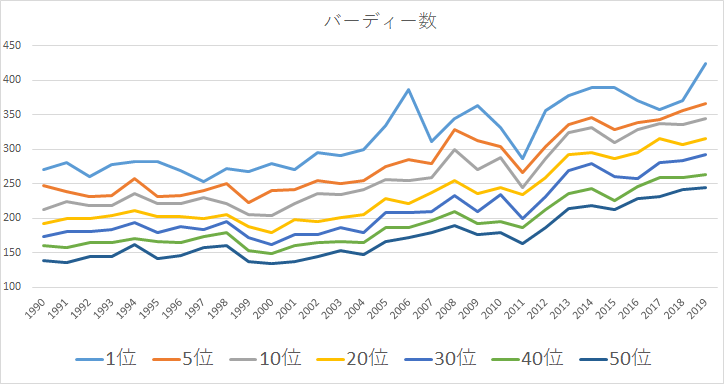 JLPGAツアーがおもしろい-といわれる要因を探った。選手の技術向上など、数多くのファクターがある。ギャラリー、ファンを沸かすのはスーパープレーだ。年間バーディー数を調べると、2019年は日本人選手がひとつの壁を破ったことに気がついた。400の大台を穴井詩、渋野日向子がクリア。過去30年間を見ていると90年は年間バーディー数1位が271で、300を突破したのは05年だった。