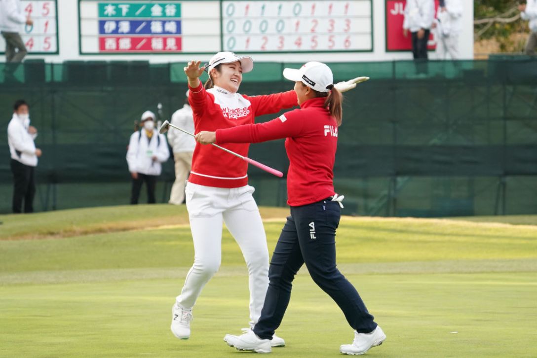 「前半では、西村さんがバーディーを決め、すごく流れが良かった。後半は私のミスで始まりましたが、うまく(引き分けに)できました。チームで団結して戦えた。3団体の対抗戦は楽しかった。ツアーでもこんな機会があればいいなぁ。(オフは)総合的に上げていきたい。飛距離を伸ばすこと、ショートゲームも向上させたい」
