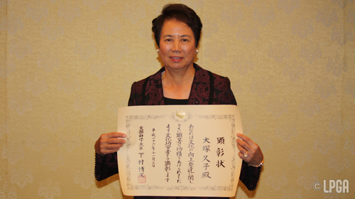 平成26年度の文化功労者に選出された日本女子プロゴルフ協会の現相談役・樋口(大塚)久子が顕彰式に出席し、顕彰状が授与されました。