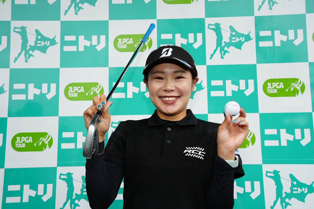 「ホールインワンは試合では初めてなので嬉しいです。記念にちょうどソファーを替えたいと思っていたので、ニトリさんからいただける達成賞の商品券で買い替えたいと思います。限られたチャンスの中でJLPGAツアーの予選を通過するのは難しかったですが、今回推薦をいただいて、大学の後輩がキャディーをしてくれたので通過することができたと思います。残り2日間もアンダーで回れるように頑張りたいです」