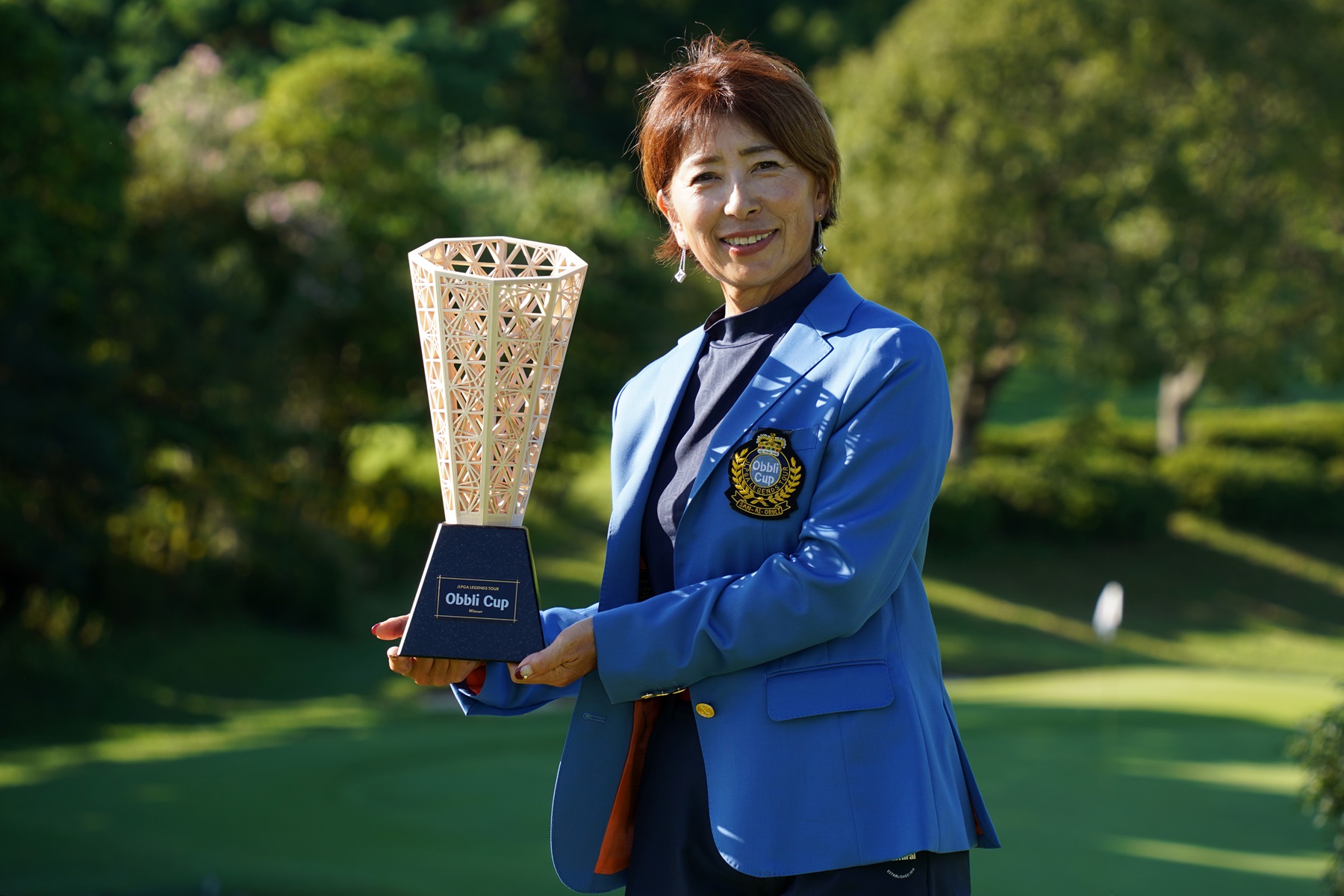 「本当に、とってもうれしいです。美加ちゃんが優勝だよって聞いたときは、全身の力が抜ける感覚で、思わず目からいっぱい汗が出てきました。皆さんから祝福されて、これからも、もっともっと頑張りたいなっていう気持ちがどんどん湧いてきました。スタート前は、次週も試合を開催していただけるので、次週につながるプレーができればと思っていたんですが、初めてゾーンに入るってことを経験できました。今回もそうですけど、グランドシニアの部を開催していただけることが本当にありがたくて、目指すものがあるっていうのが、日々の活力を生んで、スケジュールもすべてそこに合わせています。今回のObbliカップもそうですけど、試合をずっと継続していただいて、さらにレジェンズツアーがたくさん増えることを本当に望んでいます。レジェンズツアーがあることに生き甲斐を感じながら、私はこれからも努力し続けます」