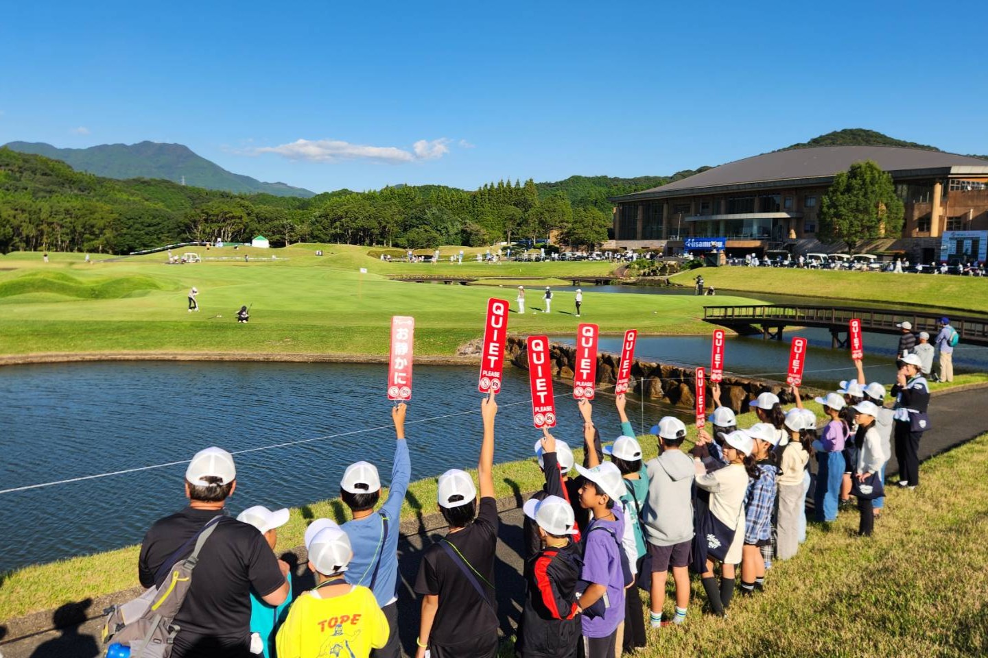 開催地の武雄市の中学生と隣接する嬉野市の小学生、計225人を招待。開催コースの若木ゴルフ倶楽部(佐賀県)を訪れ、ツアー観戦、ボランティア体験、放送センター見学、ギャラリープラザ見学を楽しみました。