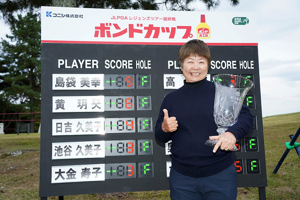「ほっとしたし、嬉しいです。きょうは緊張もせず、落ち着いていました。同じ組の方と楽しみながら、レジェンドらしいラウンドができたことがうれしかったですね。ラウンド中の雰囲気、天気、全てがマッチングしての優勝。全く悪いところがなかった。今年は調子が悪かったですが、最後の試合は頑張りたいと思っていました。(来週の誕生日を前にエージシュート達成)毎回、目の前のボールをどう打つかを考えているので、知らなかったです。来年は体調を整えて、自分のゴルフを極めていけるようなラウンド、練習をしていきたい-」