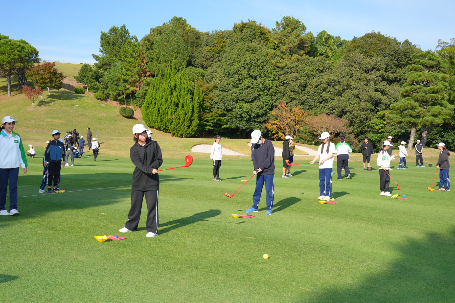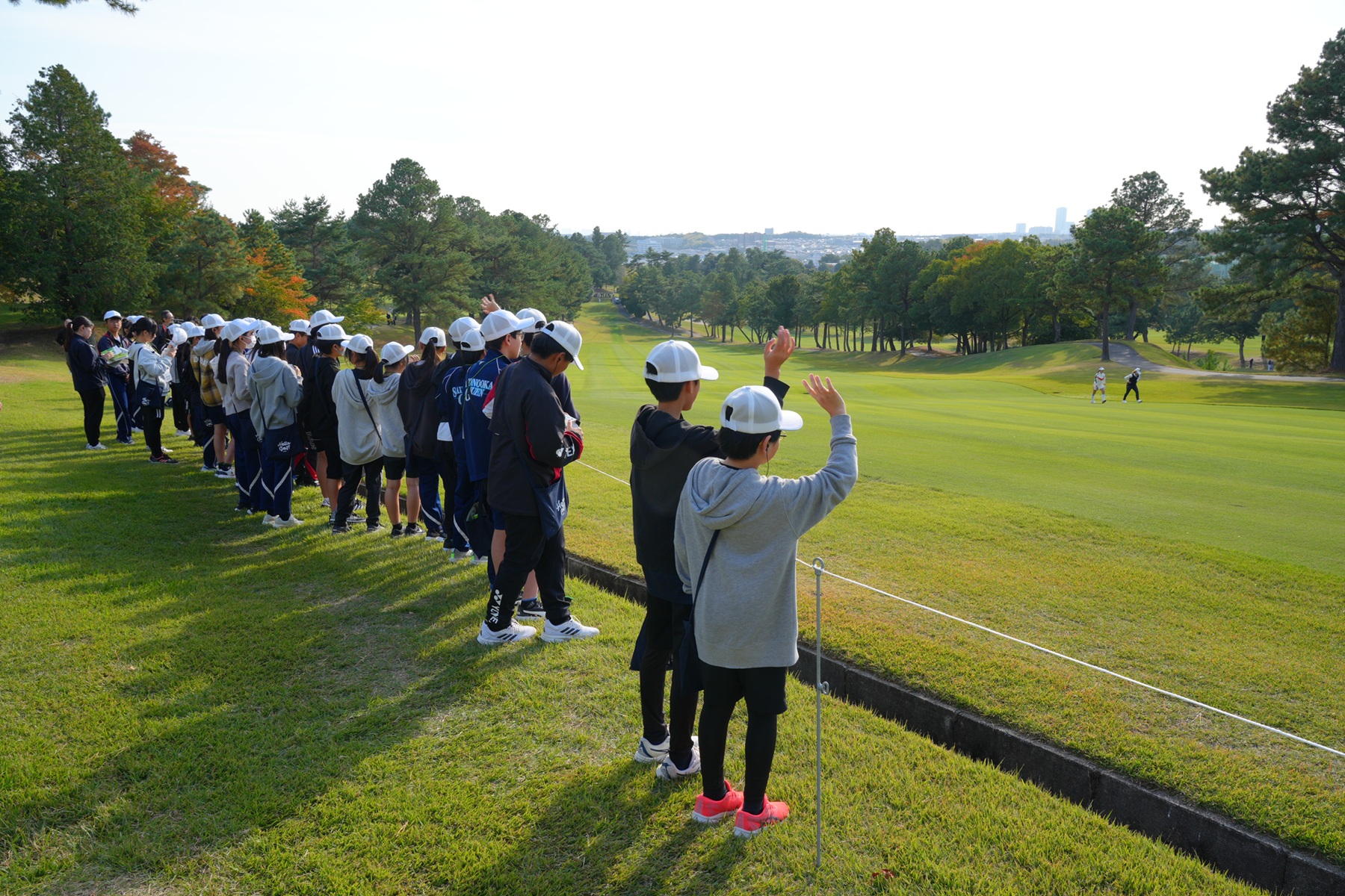 大会第1日に茨木市立春日丘小学校5年生90人、第2日には箕面市立彩都の丘学園7年生172人を招待。開催コースの茨木国際ゴルフ倶楽部(大阪府)を訪れ、ツアー観戦、ボランティア体験、スナッグゴルフ体験、ギャラリープラザ見学を楽しみました。