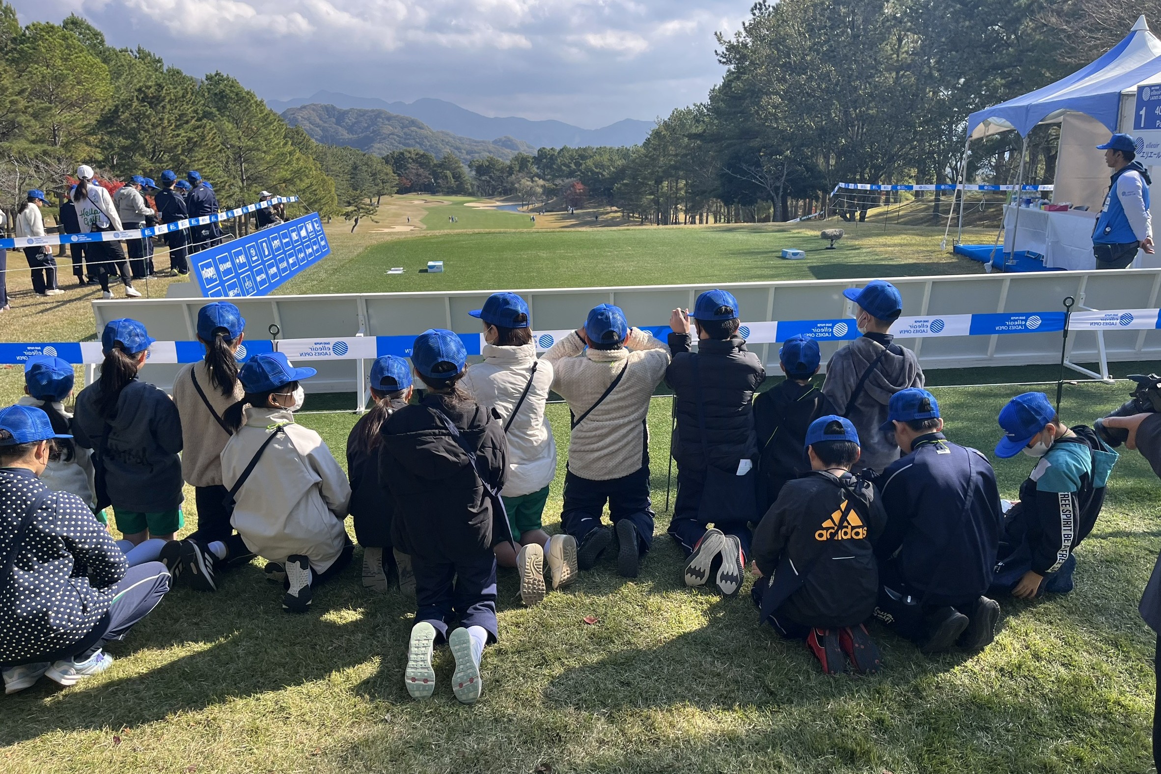 大会第1日に松山市立栗井小学校6年生56名、第2日には四国中央市立金生第一小学校6年生33名、四国中央市立三島小学校6年生29名と四国中央市立土居小学校6年生31名を招待。開催コースのエリエールゴルフクラブ松山 (愛媛県)を訪れ、ツアー観戦、ボランティア体験、放送センター見学、メディアセンター見学を楽しみました。